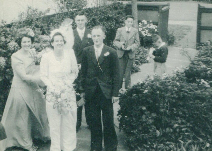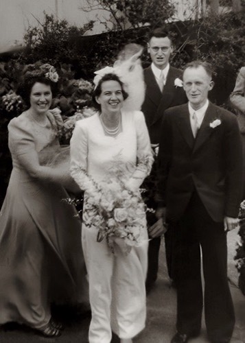 Oliver, Maurice 1921-1998 Wedding 1945. Letf-to-right, Reta Oliver, Isabel McCaul, Gilbert McCaul (brother of Isabel), Maurice Oliver. Boys unidentified.