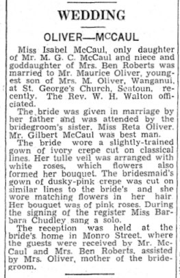 Oliver, Maurice 1921-1998 and McCaul, Isabel 1921-1970 - Wedding Clipping