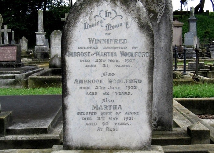 Woolford, Winnifred 1886-1907 and Woolford, Ambrose 1841-1922 and Fisher, Martha A 1842-1931 - Grave Heads Road Cemetery - photo Jan 2009