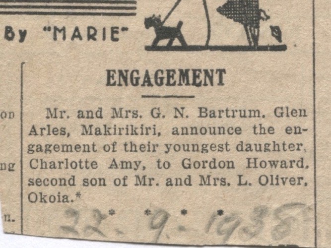 Bartrum, Charlotte Amy 1912-1982 and Oliver, Gordon Howard 1910-1954 - Engagement Notice