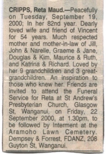 Cripps, Vincent George 1909-2002 and Oliver, Reta Maud 1919-2000 - Farm Tiropai - Kaukatea Rd in Okoia Wanganui