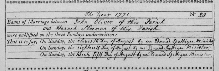 Oliver, John ca1737-1807 and Sleeman, Hannah ca 1746-1819 - Marriage Banns