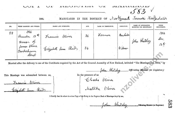 Langman, Elizabeth Ann 1841-1916 (as Reid) Marriage to F Oliver in 1866