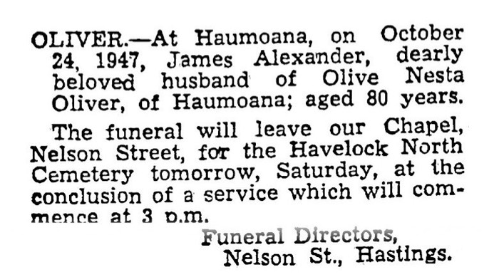 Oliver, James A 1866-1947 - Death Notice