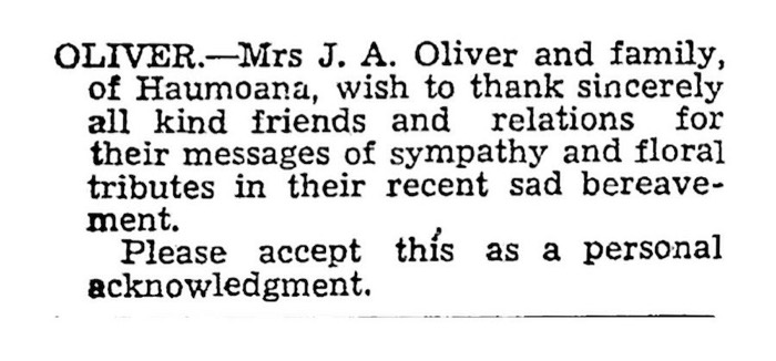 Oliver, James A 1866-1947 - Bereavement Notice