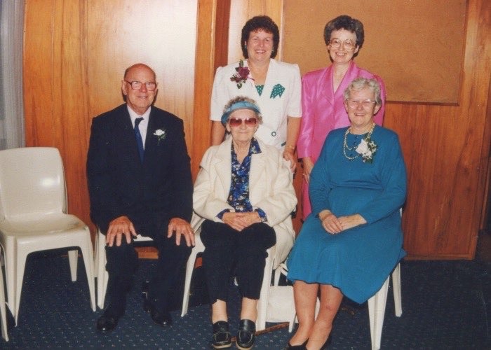 Kendall, Edward Charles (Ted) 1918-1995 and Kendall, Doris 1908-1995 and Kendall, Barbara Ann 1945-2022 (standing) and Oliver, Rachel 1940-2024 (standing) and Kilpatrick, Isabella Mary (Belle) 1921-2012 - O'Grady-Hills Wedding 3 April 1993