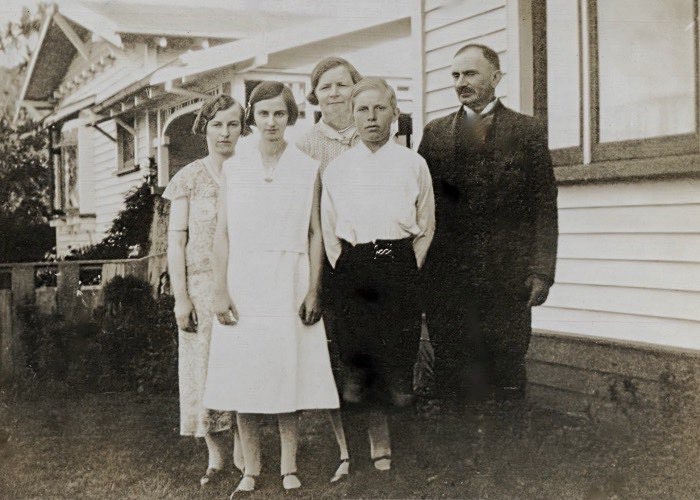 Oliver Family at Okoia. REAR Mary b1863, Louis b1872. MIDDLE Bruce b1914, Harold b1909, Doris Kendall b1908, Maud Carrel b1883. FRONT Maurice b1921 (poking out tongue), Charles b1906, Reta b1919
