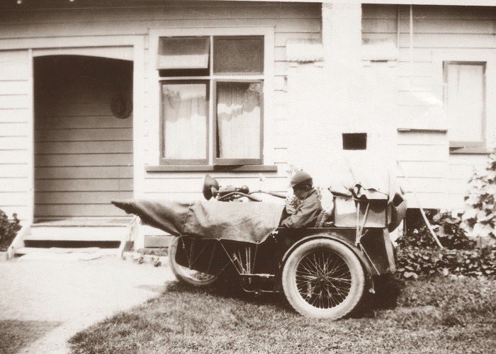 Kendall, Doris 1908-1995 - in sidecar of Charles motor-bike at Charles' Grandpa Samuel (Sam) Carrel's 1857-1943