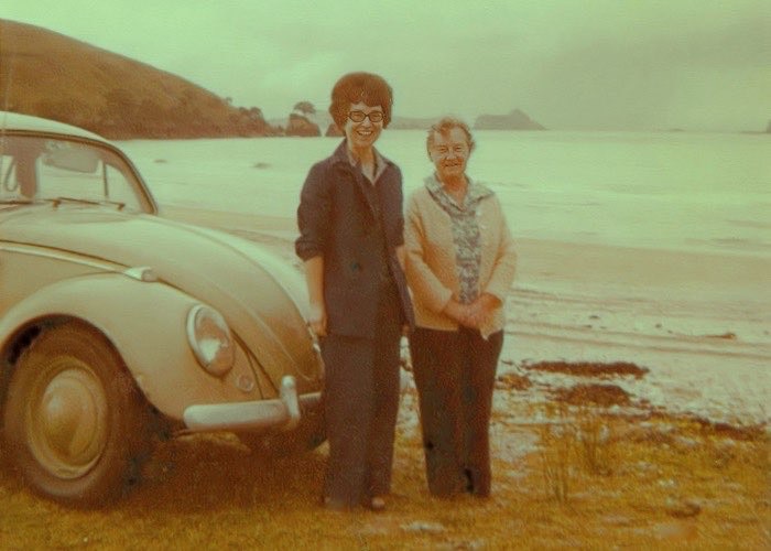 Oliver, Rachel 1940-2024 and Kendall, Doris 1908-1995 - At Matauri Bay Apr 1980 with VW Beetle car