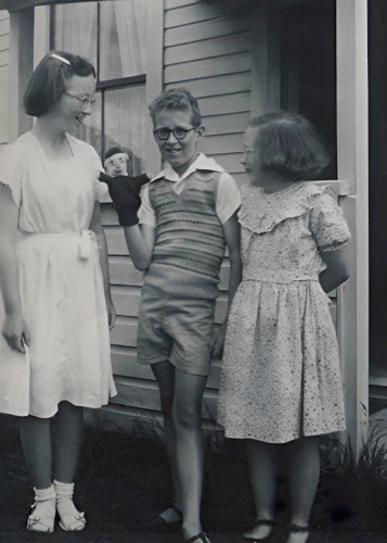 Oliver, Rachel 1940-2024 and Oliver, Bernard 1943-2011 (with puppet birthday present) and Oliver, Lois 1941-2024 - at Ohura on 19 Nov 1954