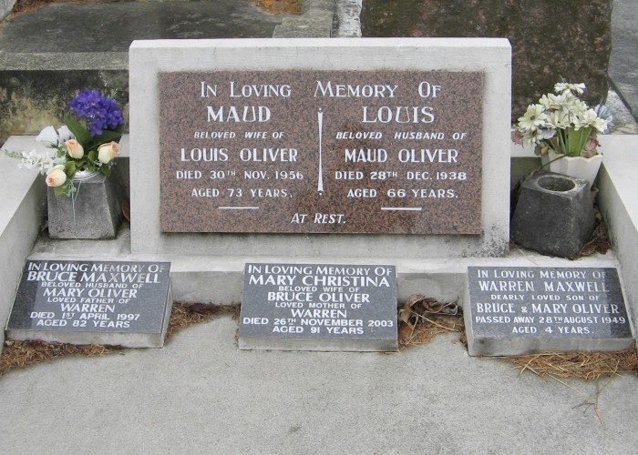 Oliver, Louis 1872-1938 and Carrel, Maud 1883-1956 and Oliver, Bruce 1914-97 and Sanko, Mary 1912-2003 and Oliver, Warren 1945-49 - Headstones Aramoho Cemetery - photo Jan 2009