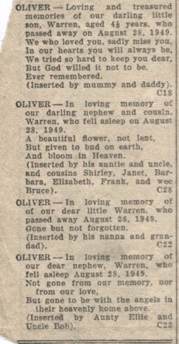 Oliver, Warren 1945-1949 - In Memoriam Notices
