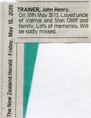 Trainer, John Henry 1917-2015 Death Notice 14 May 2015