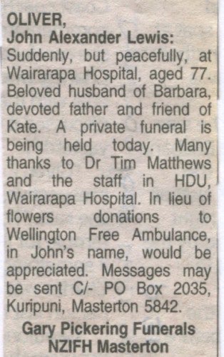 Oliver, John Alexander Lewis 1943-2020 - Death Notice