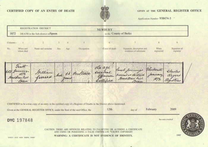 Gerrard, William 1791-1872 Death Certificate