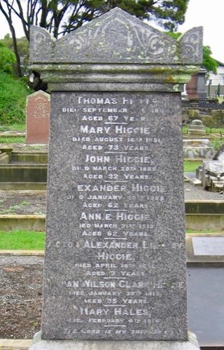 Higgie, Thomas. Clark, Mary. Higgie, John. Higgie, Alexander. Scott, Annie. Higgie, Acton A. Higgie, Adrian W C. Hales, Mary - Monument - Heads Rd Cemetery Row 14 LH - photo Jan 2009