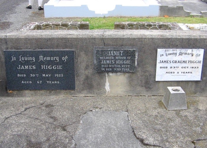 Higgie, James 1857-1925 and Cameron, Janet 1866-1959 and Higgie, James G 1928 -1933 - Closeup - Aramoho Cemetery Row C12 - photo Jan 2009
