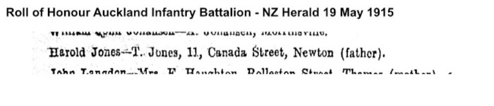 Jones, Harold 1888-1978 Roll of Honour Ak Infantry Battalion NZ Herald 19 May 1915
