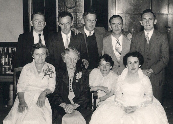 Trainer, Valmai Wedding Rear LtoR Roy, Frankie, Stewart, John (Jack), Cliff. Front LtoR Myrtle, Sophia, Dreda (Joy), Valmai