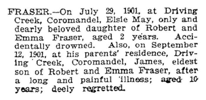 Fraser, Elsie May 1900-1901 and Fraser, James 1891-1901 - Deaths Notice - Fraser Ak Star 18 Oct 1901