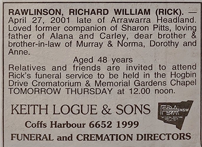 Rawlinson, Richard William (Rick) ca1953-2001 - Death Notice