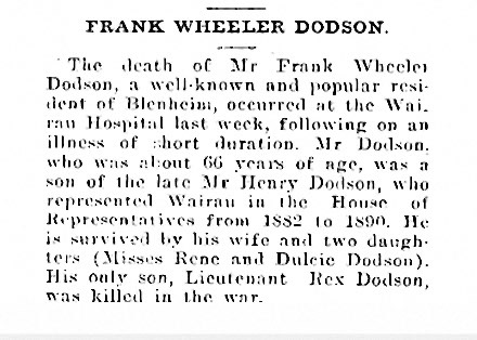 Dodson, FW 1864-1931 - Obituary ex Kaikoura Star 14 May 1931