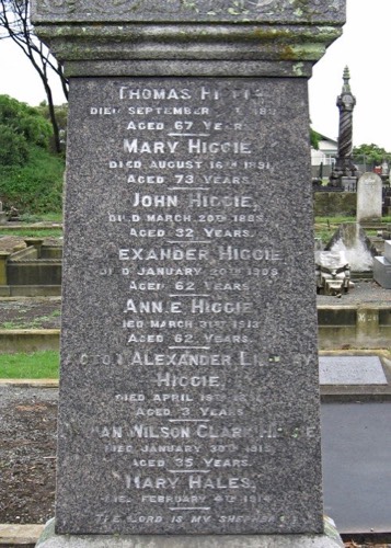 Higgie, Thomas. Clark, Mary. Higgie, John. Higgie, Alexander. Scott, Annie. Higgie, Acton A. Higgie, Adrian W C. Hales, Mary - Monument - Heads Rd Cemetery Row 14 LH - photo Jan 2009