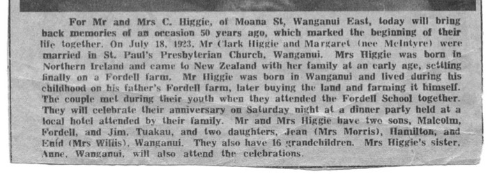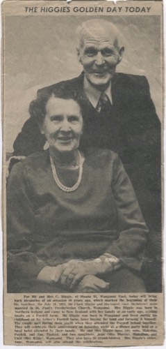 Higgie, Clark 1899-1978 and McIntyre, Margaret ca1902-1995 - text of newspaper clipping 50th Wedding Anniversary