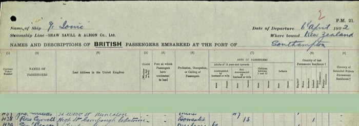 Currell, Rose - Outward Pass List on Ship Ionic dep 6 Apr 1922