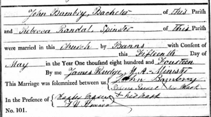 Bambry, John 1791-1854 and Randal Rebecca S 1792-1837 -marriage