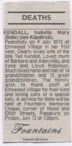 Kilpatrick, Isabella Mary (Belle) 1921-2012 - Death Notice