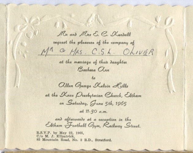 Kendall, Barbara Ann 1945-2022 and Hills, Allen George Kelvin 1941-2020 - Wedding Invitation