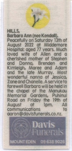 Kendall, Barbara Ann 1945 -2022 - Death Notice