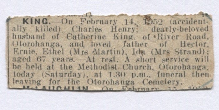 King, Charles Henry -1952 husband of Catherine Brider - Death Notice