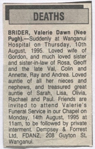 Pugh, Valerie Dawn -1995 married Gordon Brider - Death Notice