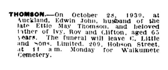 Thomson, Edwin John ca1876-1939 - Death Notice Ak Star 28 Oct 1939