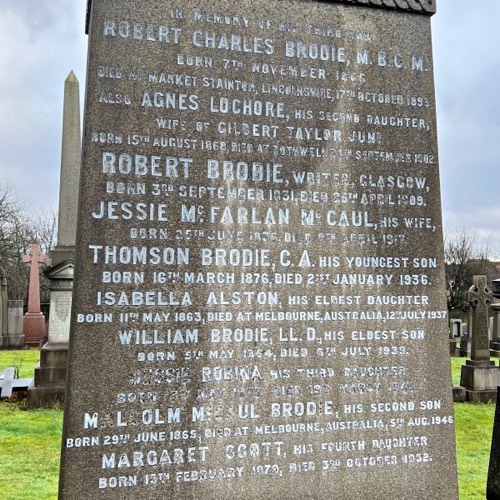 Brodie, Robert 1831-1909 and McCaul, Jessie M 1836-1917 and son Brodie, Robert Charles and daughter McCaul, Agnes Lochore - Headstone